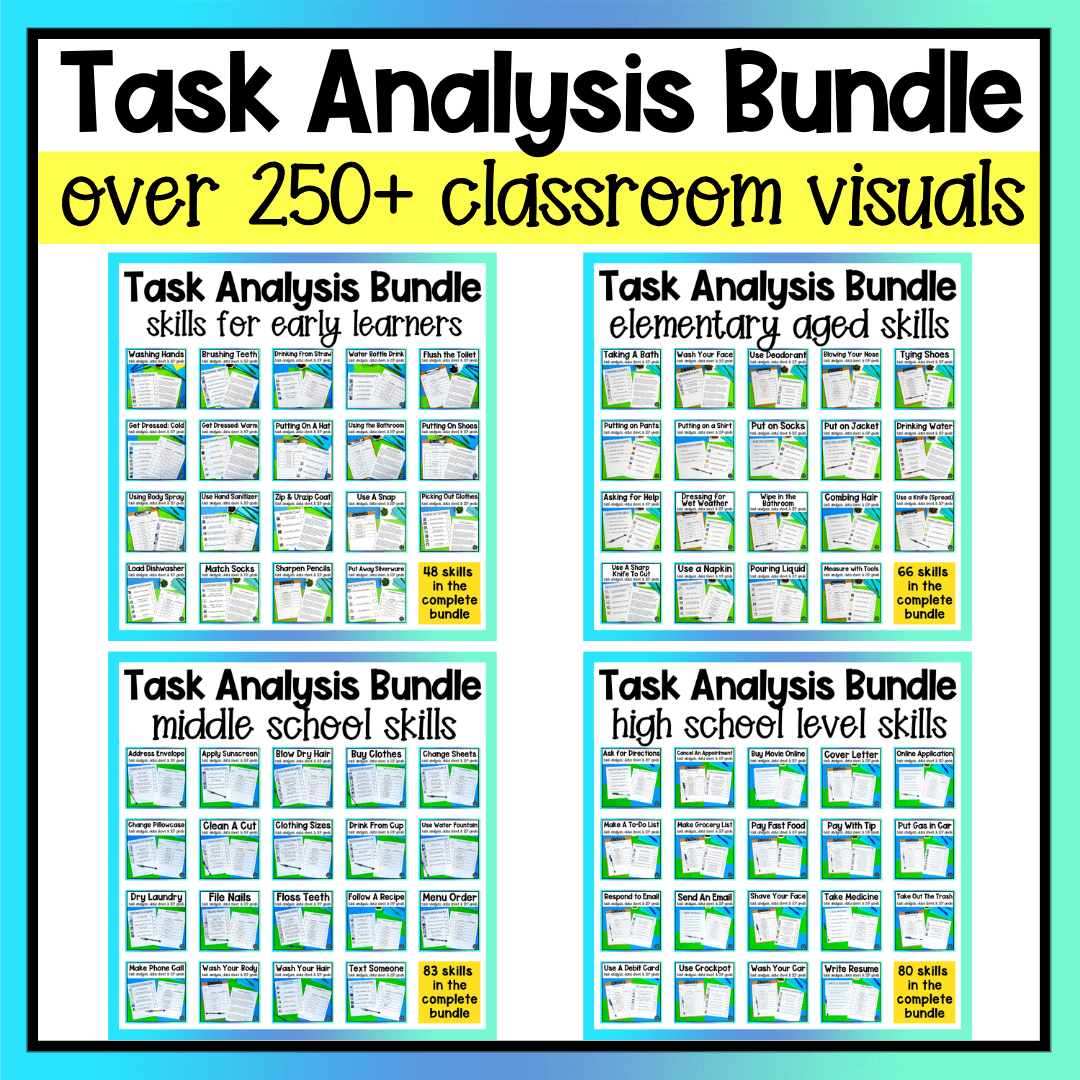 Looking for all of the task analysis resources to use in your special education classroom? If you have students looking to gain independence in their daily living skills, this is the resource you need! With this bundle, you will get access to a visual task analysis checklist focused on important life skills. These checklists serve as the perfect visual reminder for important real world tasks in activities of daily living.